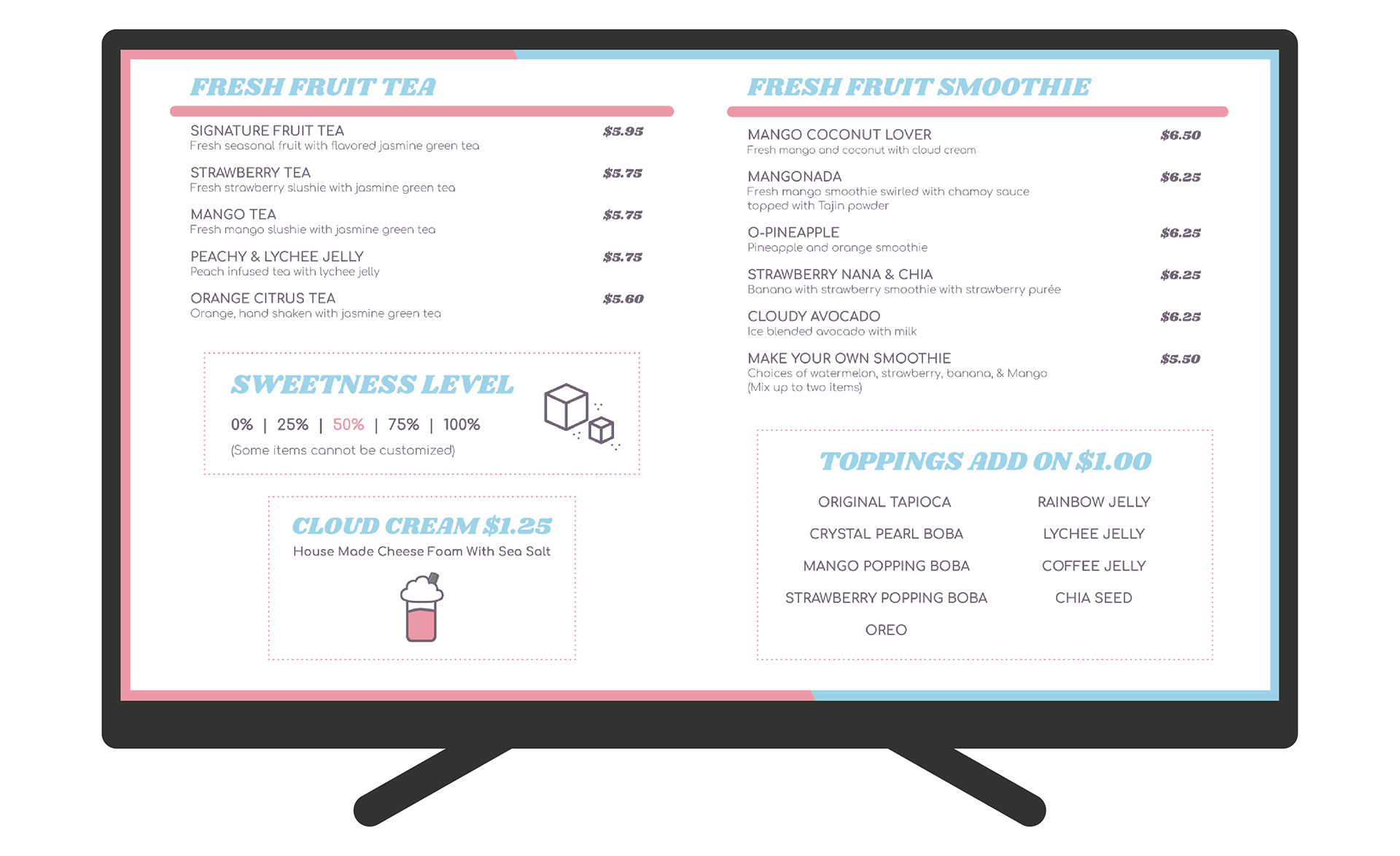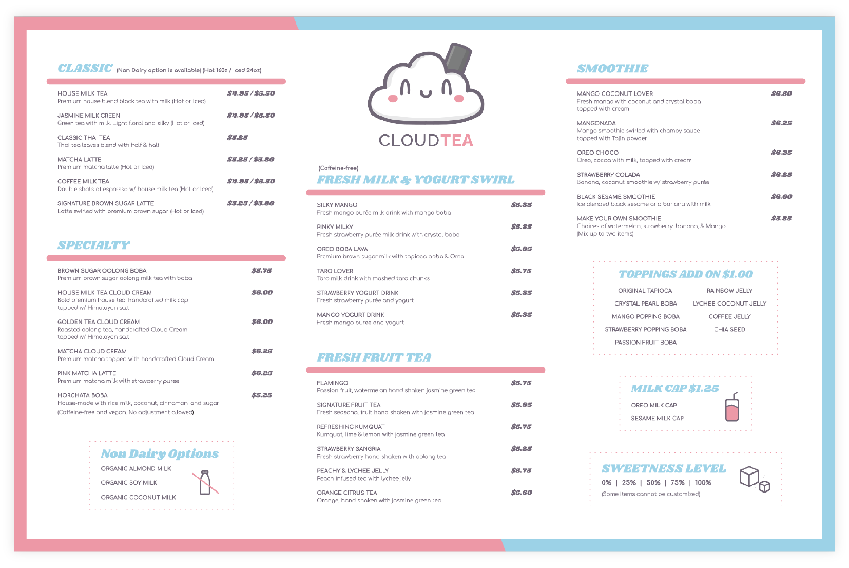 Cloud Tea is a bubble tea cafe located in the Chicago burbs. I created the branding with boba consumers and culture in mind.