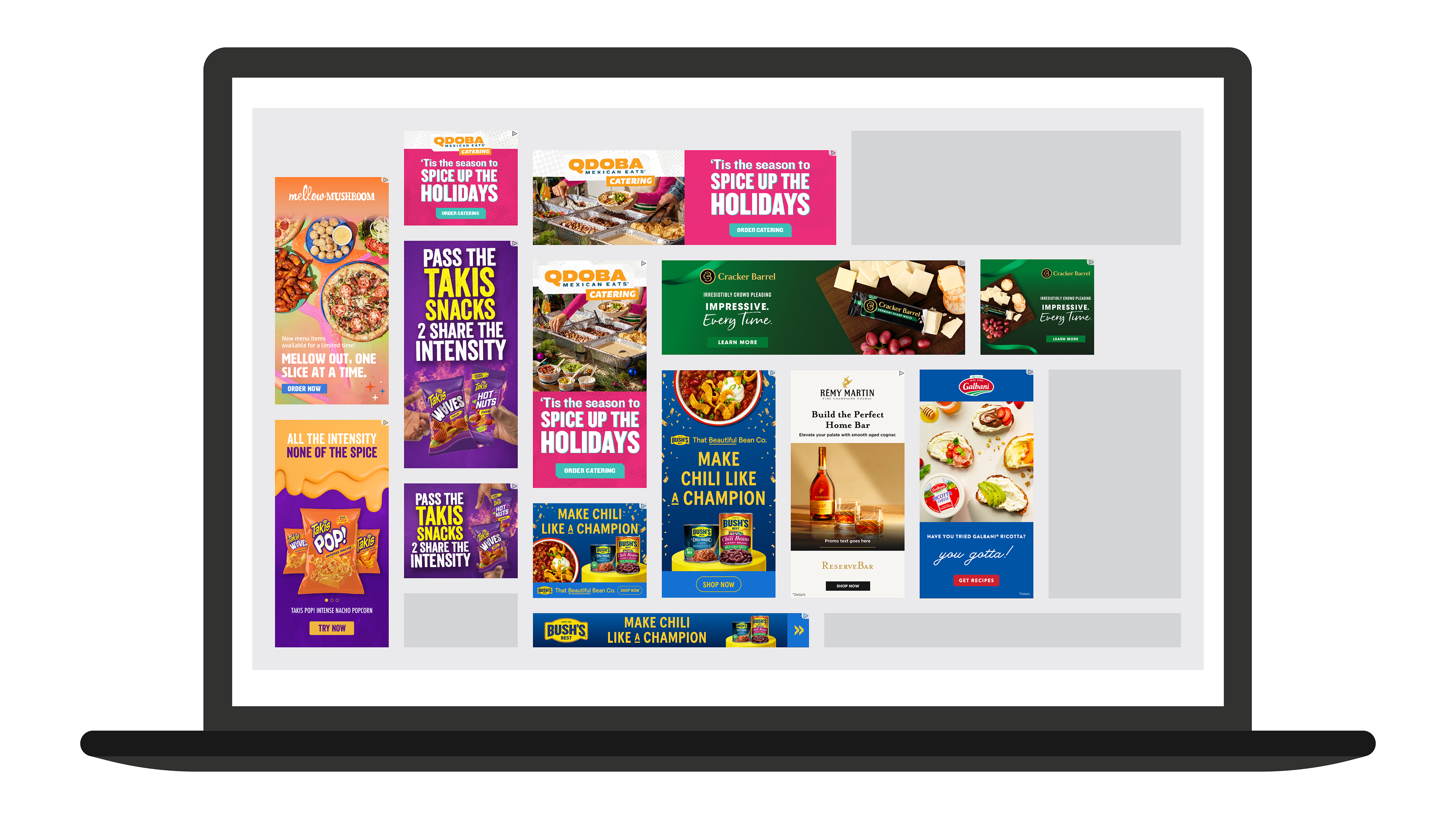 In my time as an Art Director with Epsilon I worked with just about every vertical out there with Food and Beverage as my favorite. The following examples are select sizes of digital banners for Cracker Barrel, Qdoba, Takis, Mellow Mushroom, Bush's, Reserve Bar, and Galbani. These are just a handful of the several food and bev brands I had the privilege to collaborate with.